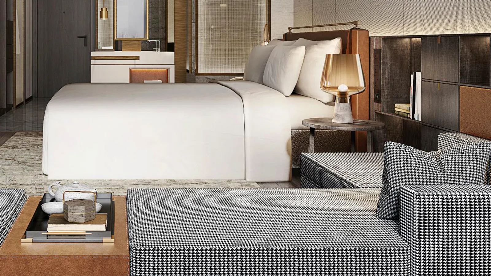 Mingsun delivered a fully bespoke guestroom suite for a luxury boutique hotel in Shanghai, featuring custom furniture—from the Corian vanity and walnut-clad headboard wall to houndstooth lounge seating and integrated lighting. Every element combines refined materials with hospitality-grade durability, seamlessly transitioning from design vision to flawlessly executed reality.