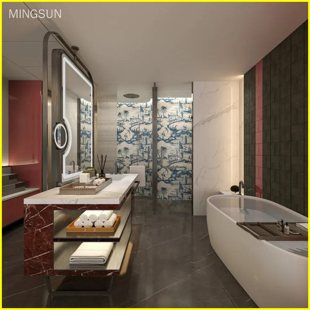 MINGSUN is a trusted hotel furniture manufacturer based in Guangzhou, China. With a 10,000 ㎡ factory and over 200 skilled workers, we deliver one-stop custom solutions for hotels worldwide. Our marble vanity console with storage is designed for easy maintenance, long service life, and a High Quality guest experience.