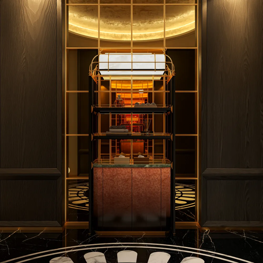 Infuse your hotel suite, spa lobby, or high-end retail store with the timeless glamour of this Art Deco-inspired display unit. The design is crowned by a magnificent arched light box, featuring a translucent alabaster-look panel (acrylic or resin) encased in a gold cage, casting a soft, atmospheric glow over the items below. The structure combines sleek matte black side panels with delicate brushed gold shelving rails, creating a perfect stage for perfumes, towels, or curated artifacts. The unit is grounded by a stunning storage cabinet finished in rare burl wood veneer, known for its swirling, intricate grain, topped with a slab of emerald green marble.