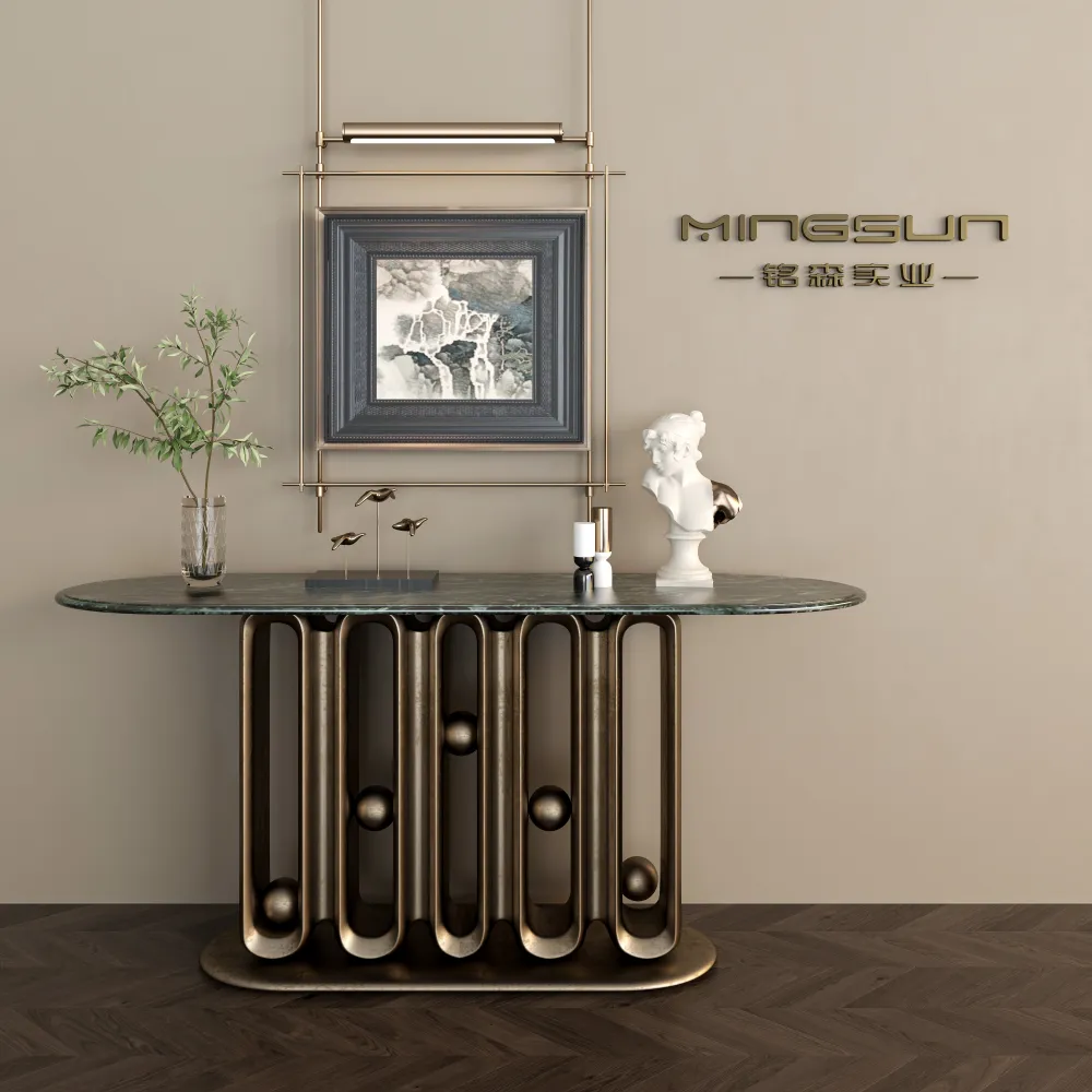 Make a sophisticated first impression with this breathtaking console table, where natural elegance meets architectural artistry. Its rich green marble top, veined with white and black, creates a dynamic, organic focal point, while the sculpted, fluted brass base adds a touch of timeless luxury and visual intrigue. Designed as a statement piece for hotel lobbies and entryways, its sleek, oval form provides a perfect surface for decorative objects or guest amenities. This is more than just furniture—it’s a curated experience that welcomes guests into a world of refined design.