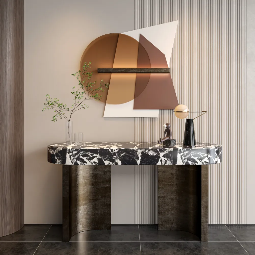 Command attention in your hotel’s entrance with this bold, contemporary console table. Its dramatic Nero Marquina marble top, featuring striking white veining against a deep black background, creates an instant visual anchor. The sculpted, curved metal legs provide a sleek, architectural foundation that elevates the piece from mere furniture to a statement sculpture. Designed for luxury hospitality spaces, its generous oval surface offers ample room for decorative displays or guest amenities, transforming any entryway into a curated gallery of modern design.