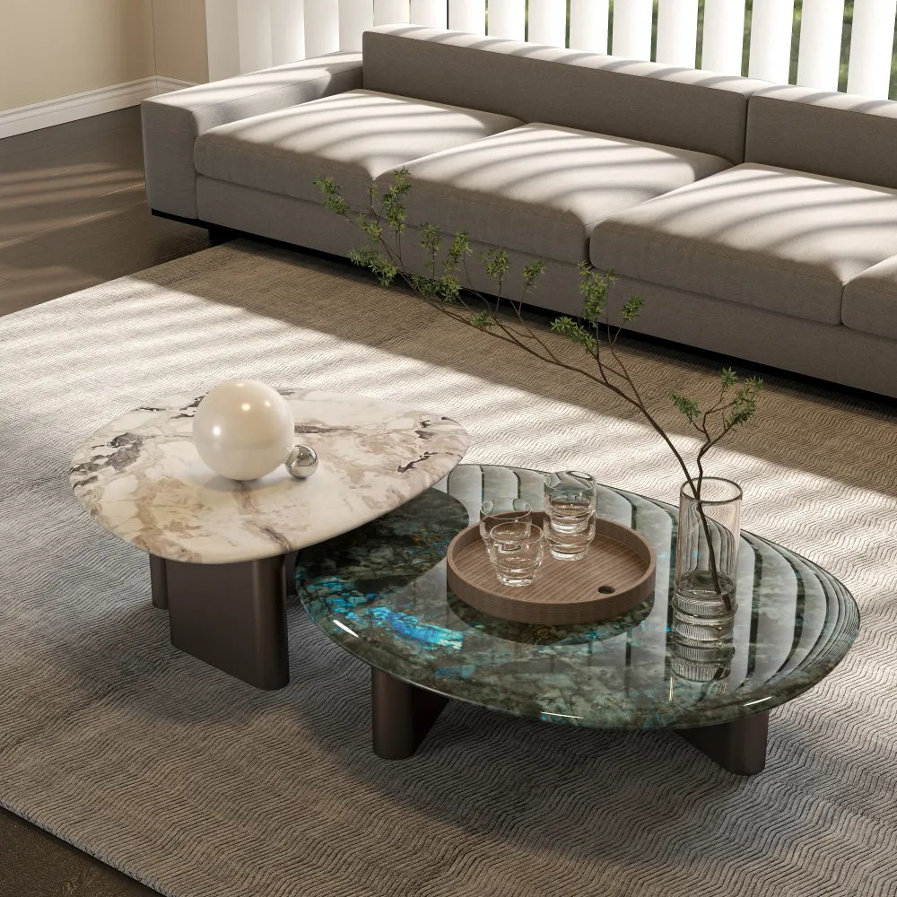 Redefine your hospitality space with this striking asymmetric coffee table set, designed to serve as both a functional centerpiece and an artistic statement. Featuring two distinct stone tops — one in classic white marble veining, the other in vibrant green-blue agate — it creates dynamic visual contrast while offering versatile surface areas for drinks, decor, or guest interaction. The sculptural, matte bronze-finished metal base provides stability and modern elegance. Crafted by MINGSUN, a Guangzhou-based manufacturer specializing in high-end commercial furniture, this set is built for durability and refined aesthetics, perfect for luxury hotel lobbies, executive lounges, or upscale residential projects.