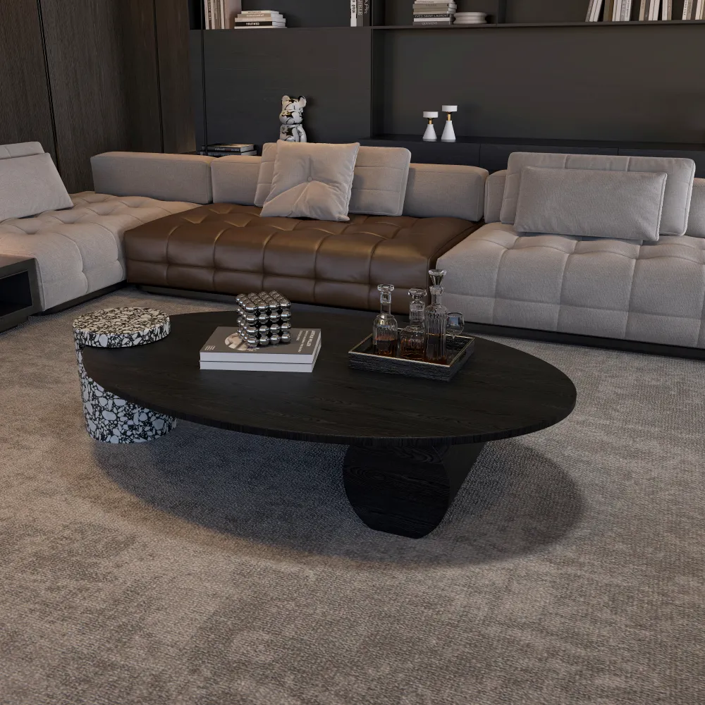 Anchor your hospitality space with this striking oval coffee table, designed to merge sculptural form with functional elegance. Its dark wood-grain top and bold, asymmetrical base create a dynamic visual anchor, while the integrated terrazzo stool offers versatile seating or side-table functionality. Perfect for luxury hotel lobbies, executive lounges, or upscale residential projects, this set is crafted by MINGSUN, a Guangzhou-based manufacturer specializing in high-end commercial furniture that balances durability with refined design.