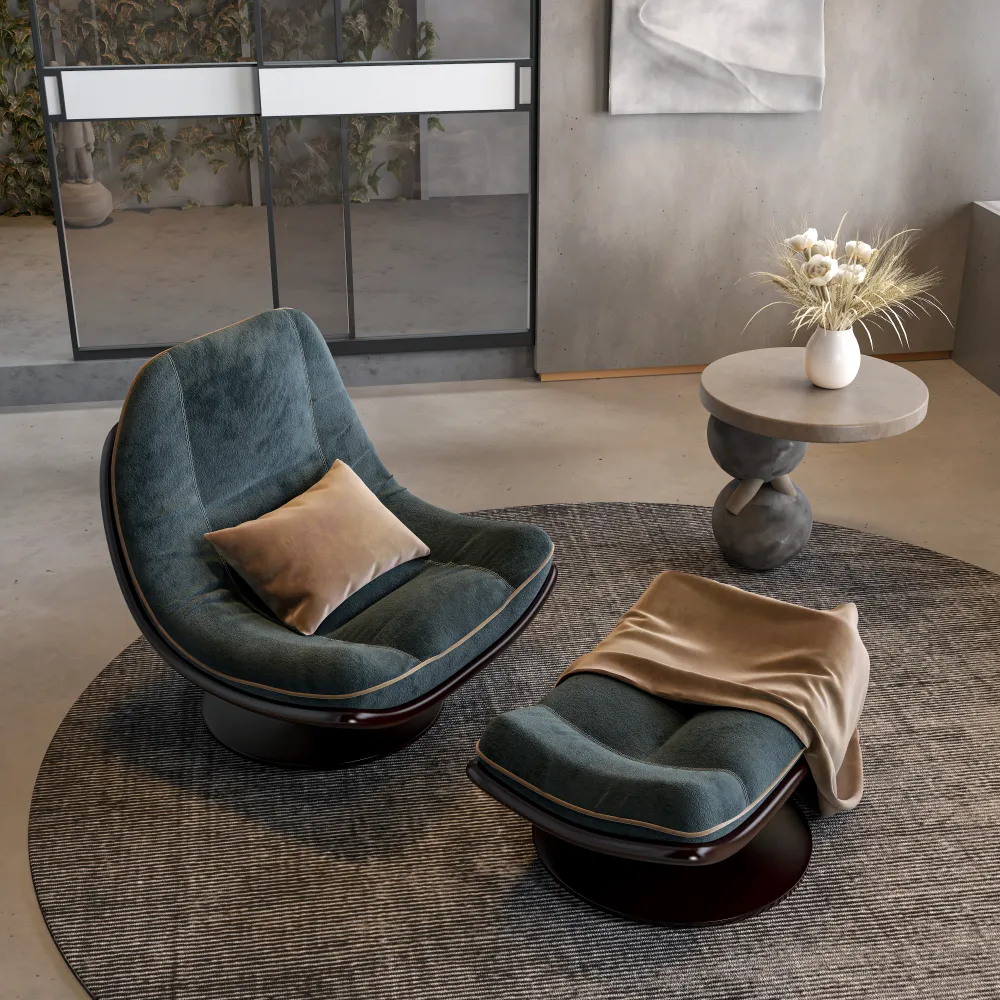 Indulge guests in unparalleled comfort with this sculptural swivel lounge chair and matching ottoman, designed for relaxation and refined style. Crafted with plush, deep teal velvet upholstery and accented with contrasting beige piping, the set features a sleek, dark wood frame and a 360° swivel base for effortless movement. The ergonomic design cradles the body, while the generously padded ottoman invites extended lounging. As a Guangzhou-based manufacturer, MINGSUN ensures every piece is built for durability and luxury, making it ideal for high-end hotel suites, spa waiting areas, or private residences where comfort meets contemporary elegance.