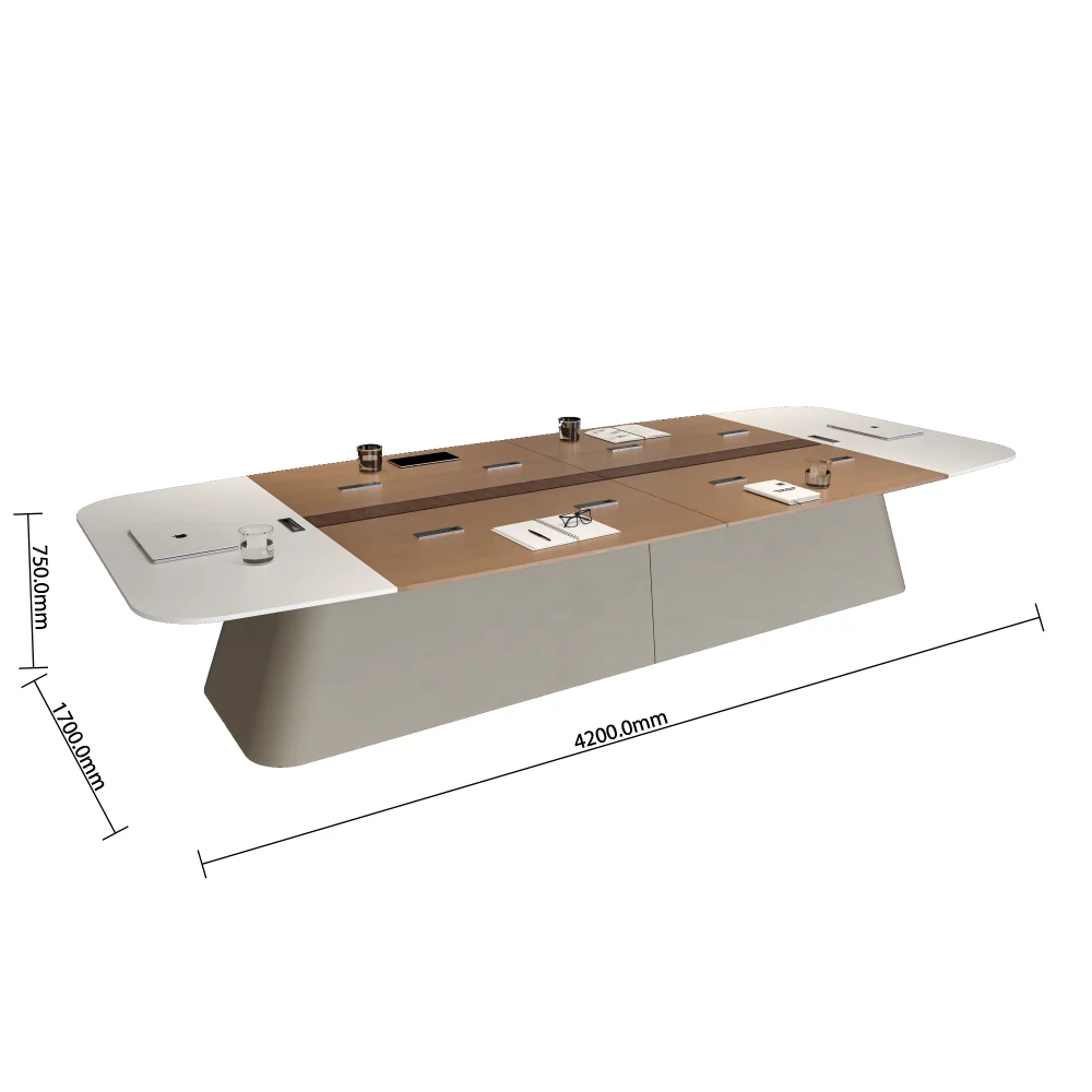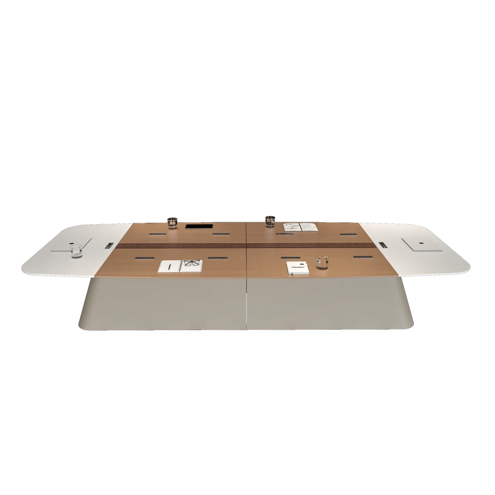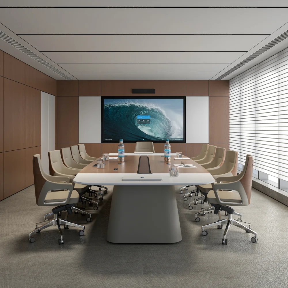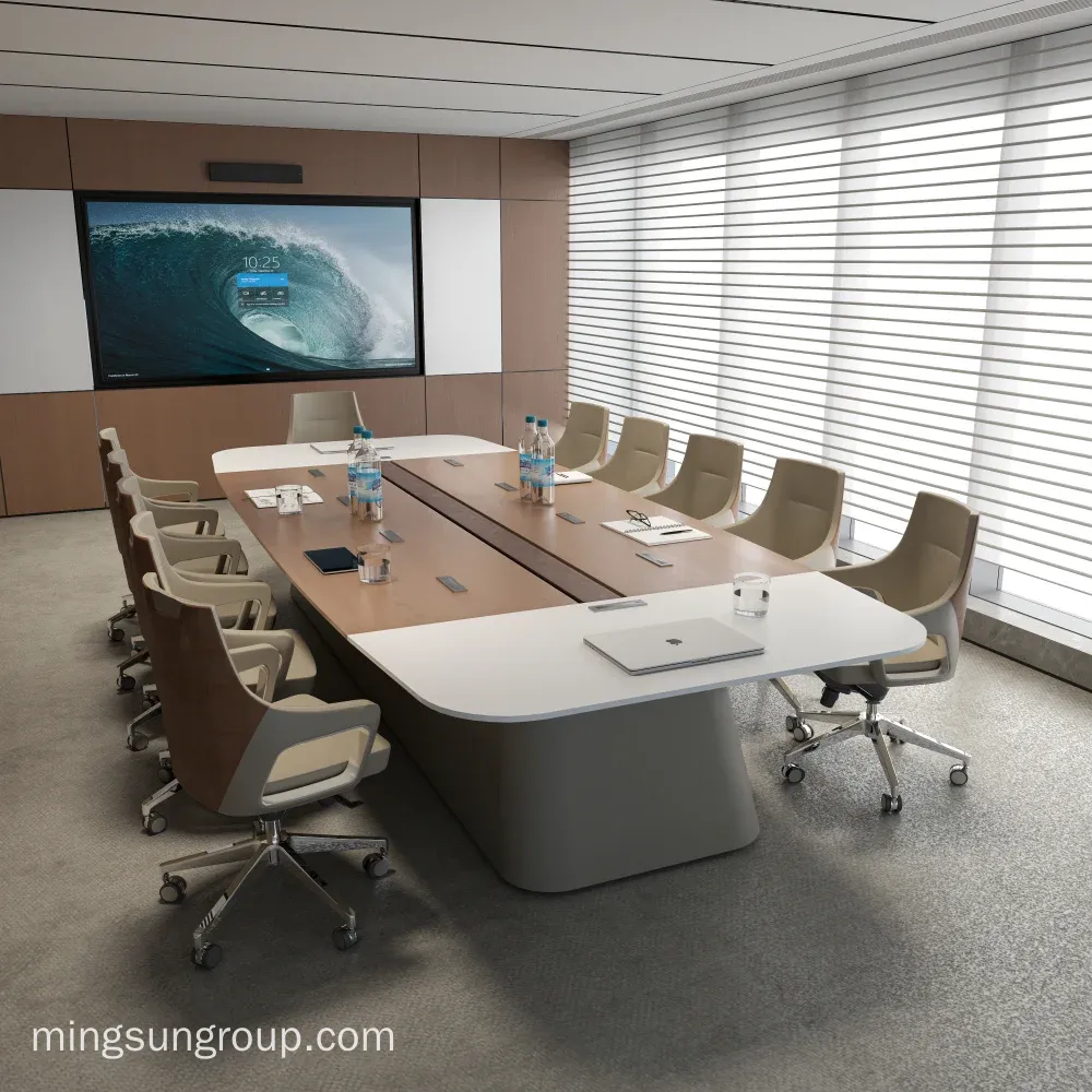 MINGSUN offers tailored sizes, edge profiles, finish combinations, and base styles to fit room layouts and brand standards. Choose from a range of colors, wood grains, and metal accents. Typical options include lengths from 240cm to 420cm and flexible power/data ports to support AV needs.