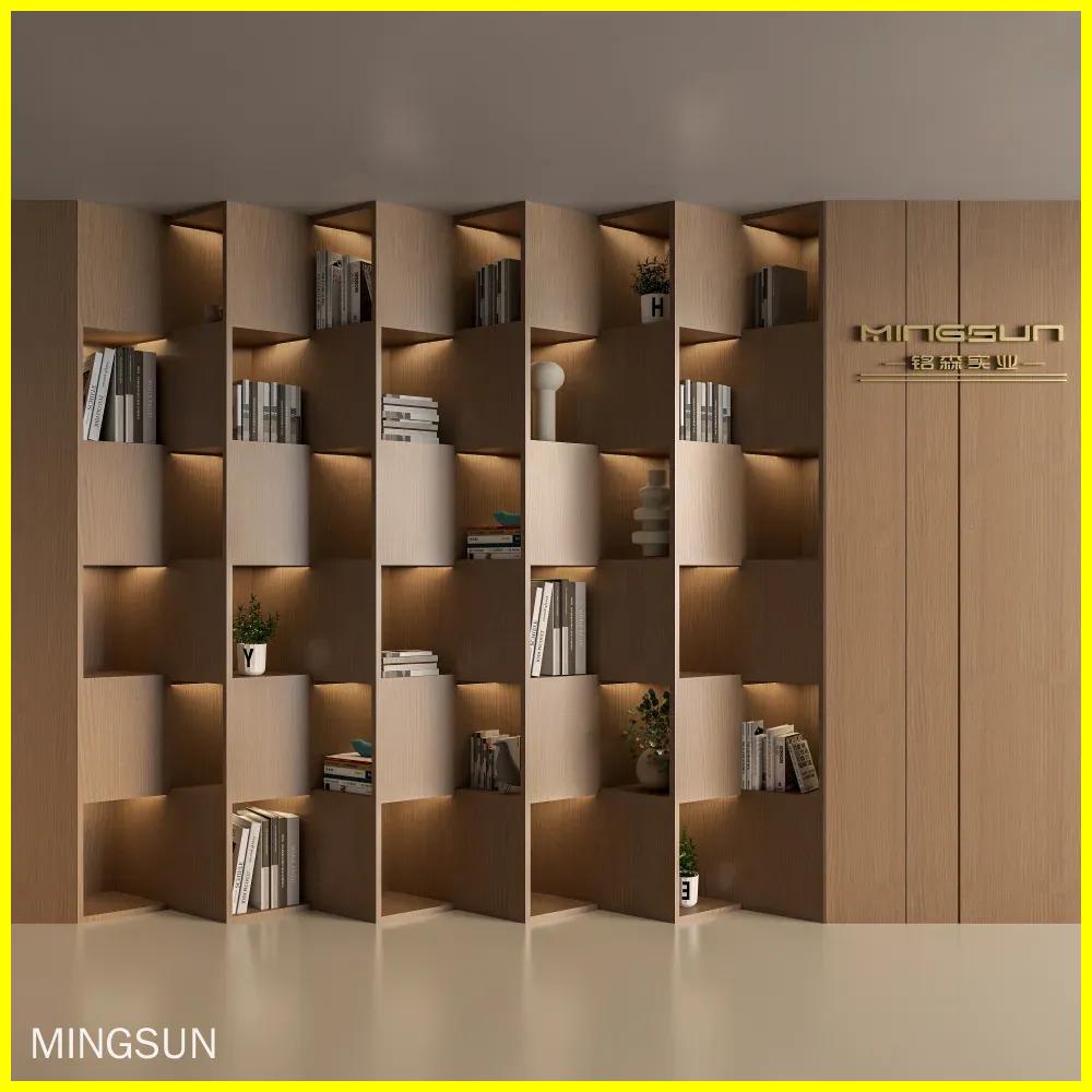 MINGSUN provides one-stop custom solutions. Choose dimensions, wood species, finish color, shelf spacing, and integrated lighting to match your project’s style. Our in-house design team collaborates with clients to ensure the bookshelf complements overall interior design and operational needs.