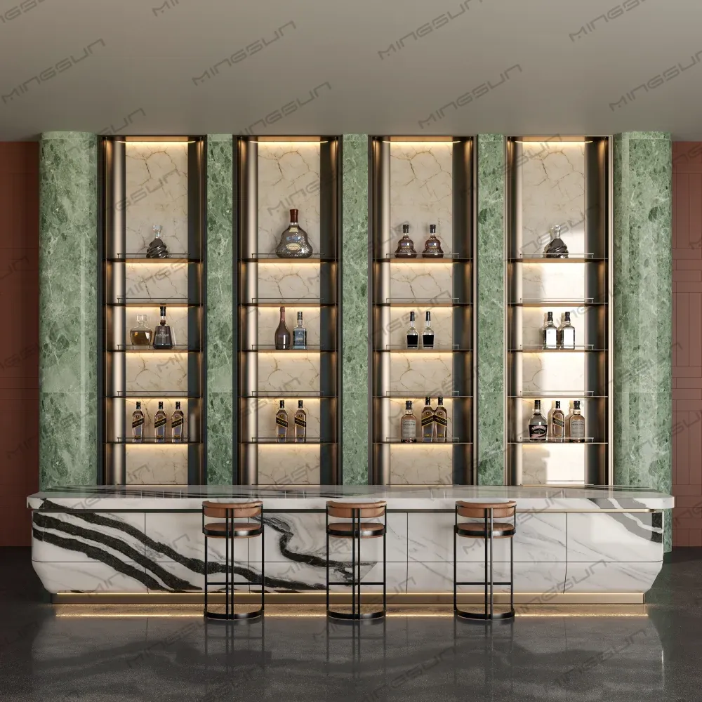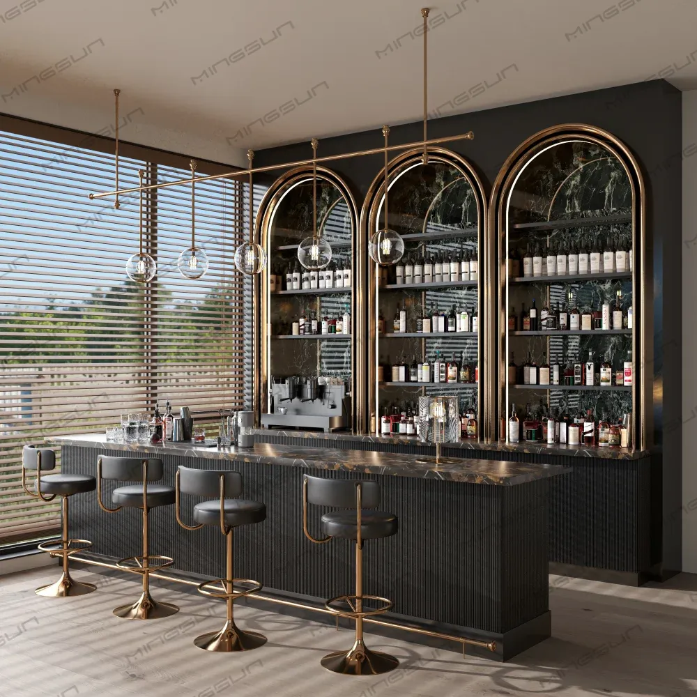 Luxury Triple-Arched Bar Display Wall with Green Marble Backdrop & Integrated LED Lighting